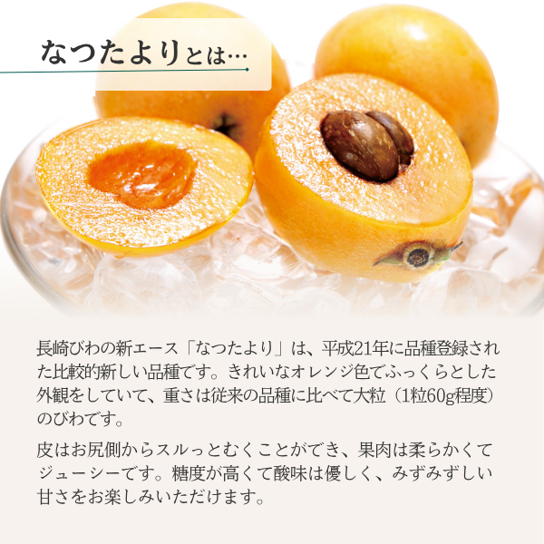 JA長崎せいひ公式オンラインショップをご利用いただき、誠にありがとうございます。 当店の「なつたより【長崎びわ】」を美味しく召し上がっていただけて、スタッフ一同大変光栄でございます。 なつたよりは果肉が大きく柔らかいため食べ応えがあり、しっかりとした甘みをお楽しみいただけます。 これからもお客様にご満足いただける高品質な商品づくりに努めてまいります。 改めまして、この度は当店をご利用いただきまして、誠にありがとうございました。 またのご利用をスタッフ一同、心よりお待ちしております。